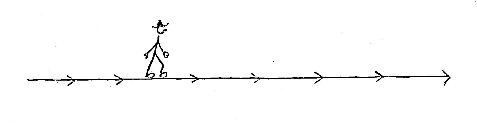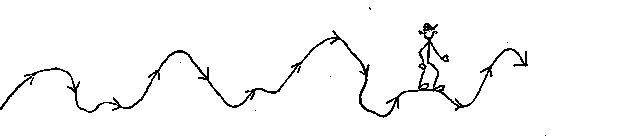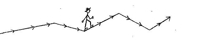 Although direction is sometimes a handy way of looking at determinate verbs, it can cause some con-fusion. The phrases "to the movies", "home", and "into the room" really say more about destination than direction. The point is this: if you can see (visualize in your mind's eye) a motion in progress, then whoever or whatever is moving at any given moment can only be moving In one direction. This is self-evident. A better way to look at determinate motion is to visualize a simple progressive motion along a line. This line is not necessarily straight. Turn to the next page and consider the drawings of determinate motion.