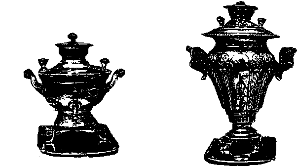 The самова́р samovar has become something of a Russian national symbol. Contrary to what many foreigners think, the samovar holds only heated water; the зава́рка concentrated tea is usually in а ча́йник small teapot which sits on top of the samovar, where it stays warm. Russians make tea by pouring the tea concentrate into a cup or glass and diluting it with boiling water. You'll often be asked: «Вам покре́пче, или послабе́е?» "Do you like yours strong or weak?"