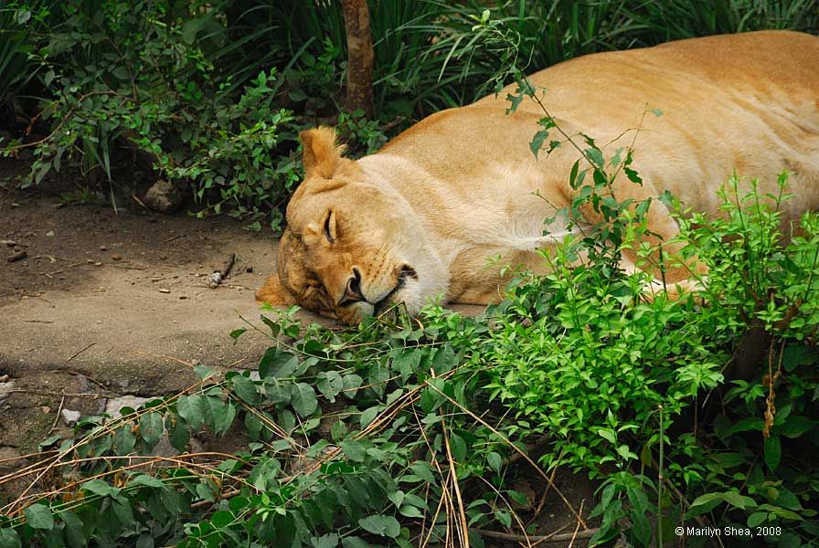 | This lioness 母狮子 (mǔshīzi) was so still that she hardly seemed to be breathing. Cats sleep 13.2 hours per day on average. Among the lions, sleep is an even larger part of their day. The male lion will sleep 20 hours a day given half a chance. Lions, especially the lioness, are awake mostly during the night. The lioness hunts at night, so the daytime is devoted to a good snooze.