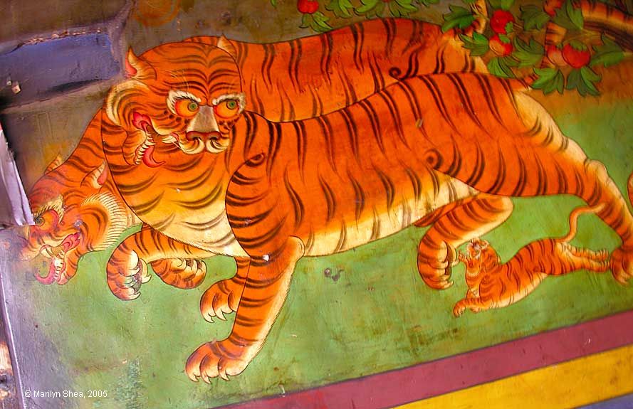 The tiger is a common symbol in Buddhism. I took the picture below in a Tibetan monastery. It was a door painting. The tiger can have multiple meanings and is a central character in many stories.