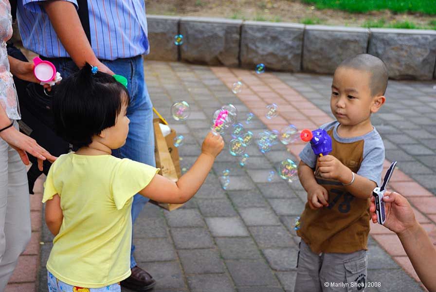 | The parents were happy, the kids were happy, and this is the last shot I took because the kids wanted the adults to blow the bubbles so they could chase and pop them. Pretty soon we had about ten or fifteen kids chasing bubbles. The vendor was happy. She sold a lot of bubbles that day. Parents tucked them away in their bags for future happy moments. |
