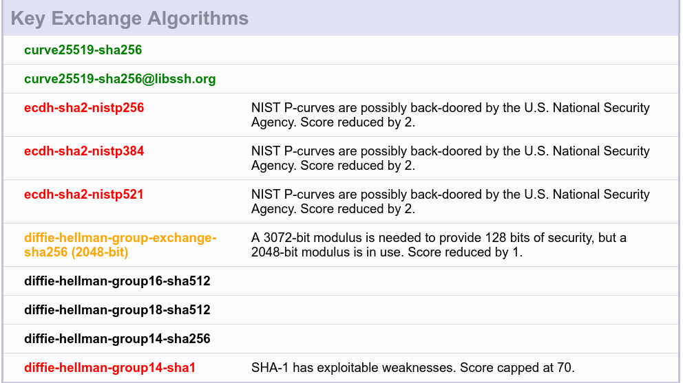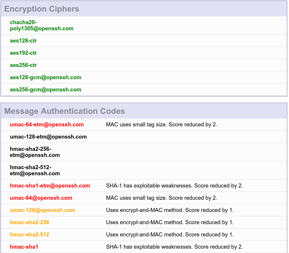 le serveur SSH est troué (pas vraiment, simplement, il garde une compatibilité avec des protocoles anciens plus très sûrs).... voilà le résultat sur le serveur brut de fonderie (j'utilise l'adresse IPV6 pour qu'il soit accessible de l'extérieur par le site: audit ssh: