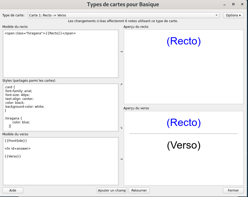 Nous allons appliquer un style css aux Hiraganas. Pour cela nous allons créer une classe (c'est comme cela que cela s'appelle en CSS et HTML) et l'appliquer aux Hiraganas (donc le recto.)